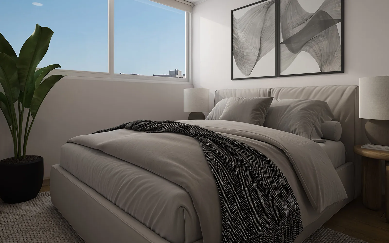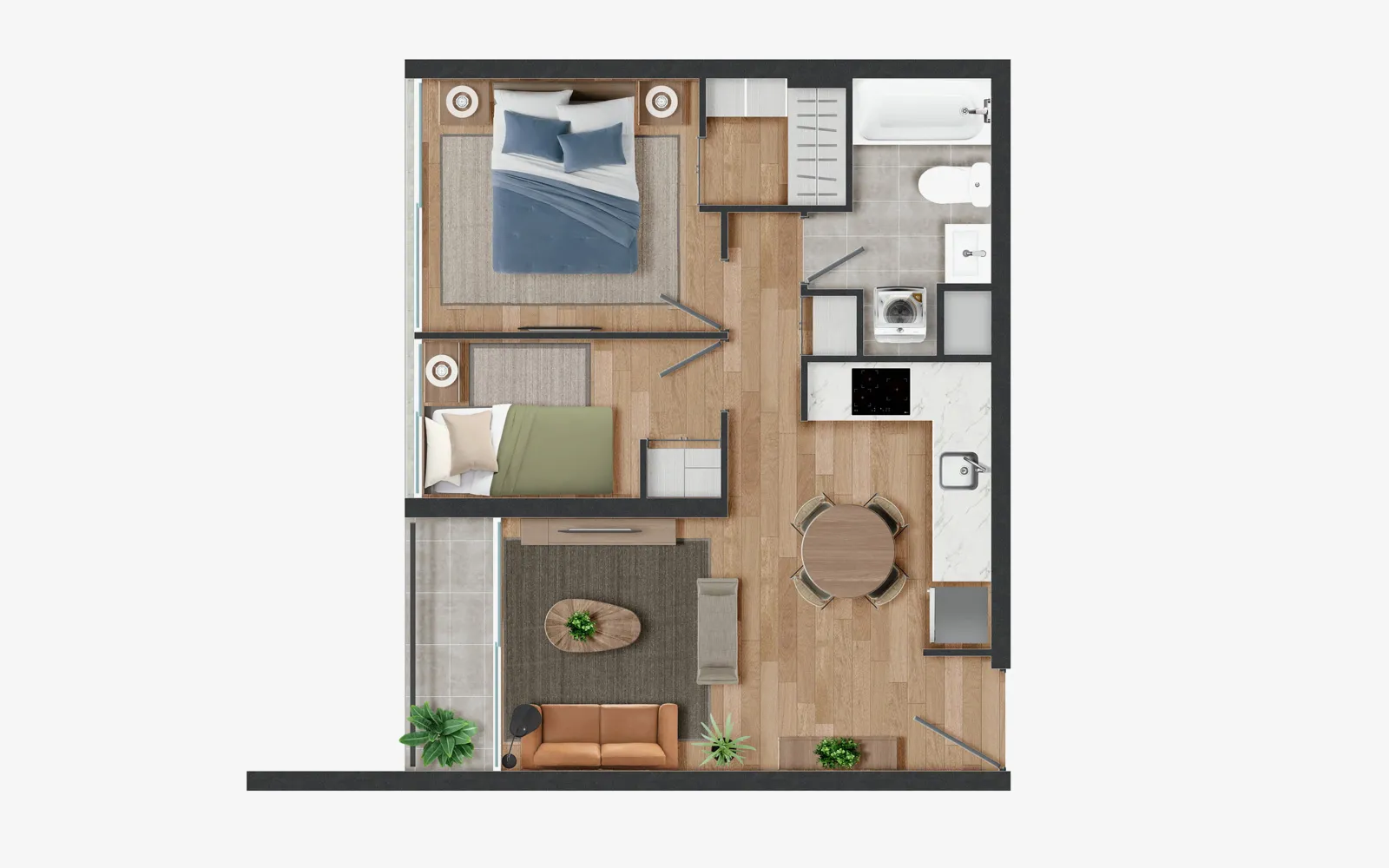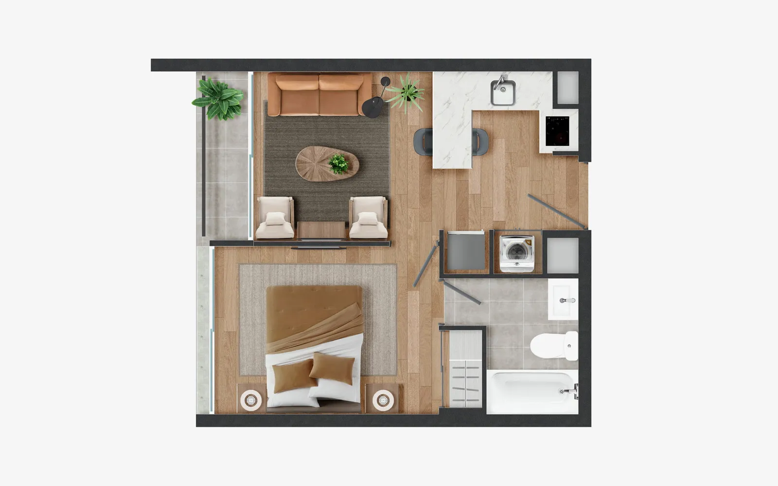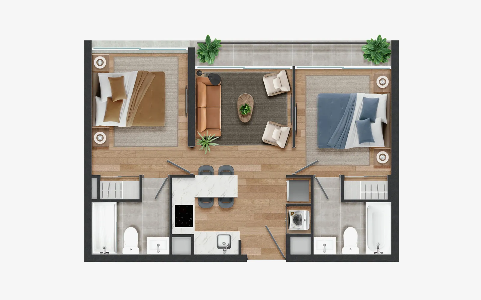 Piso vinílico SPC en áreas principales y cerámica en baños y terrazas, asegurando fácil mantención y mayor durabilidad.