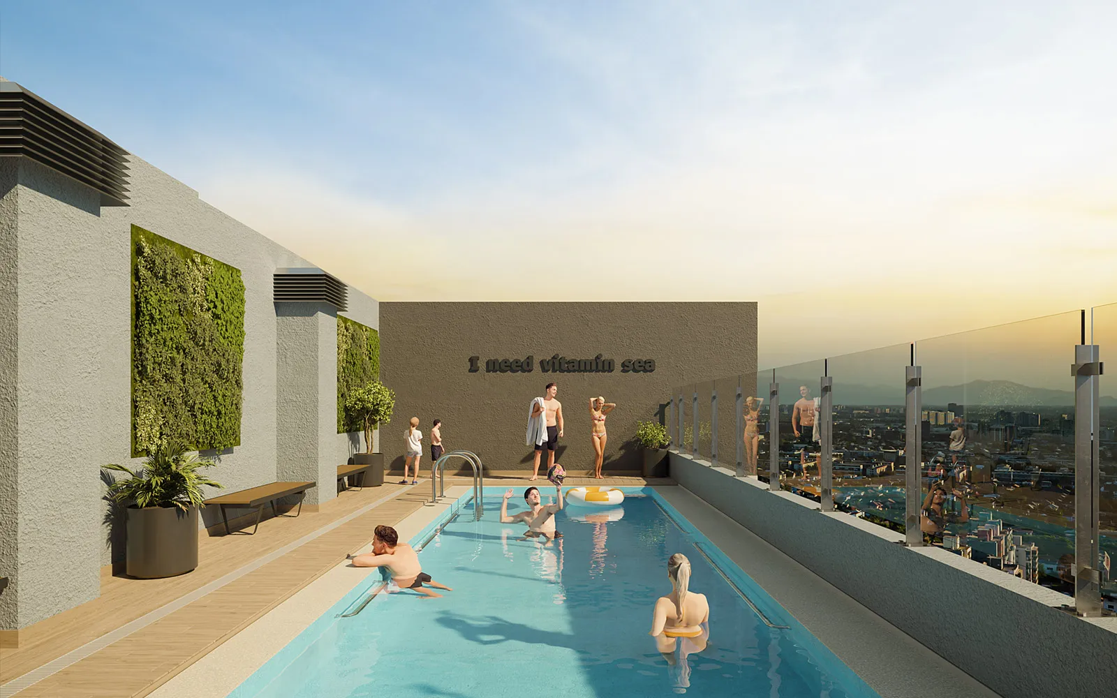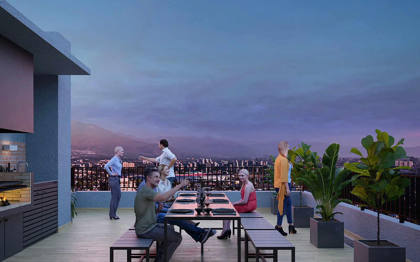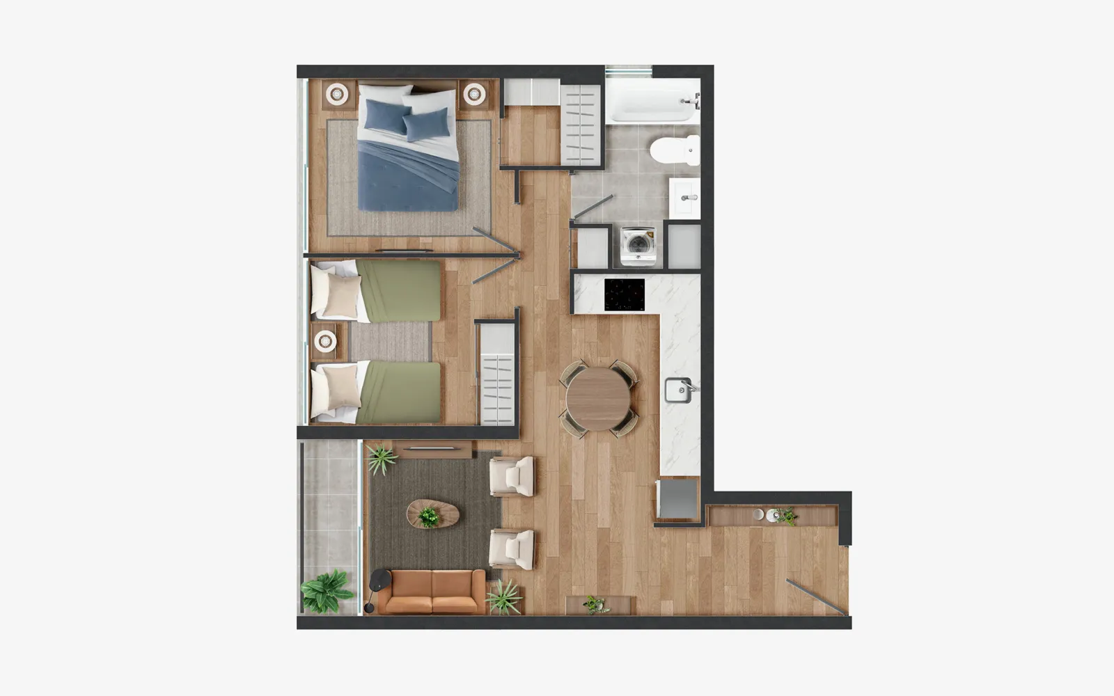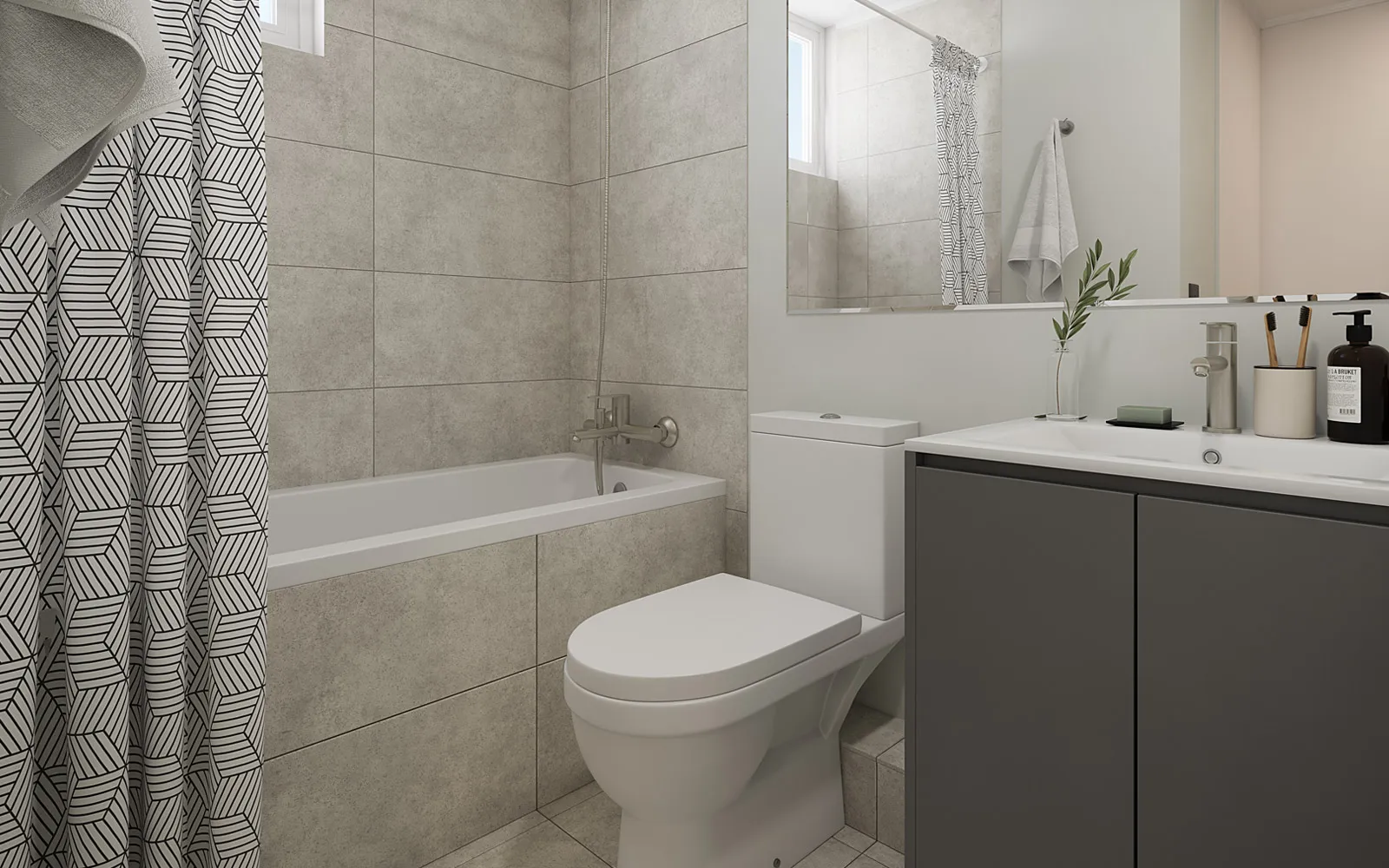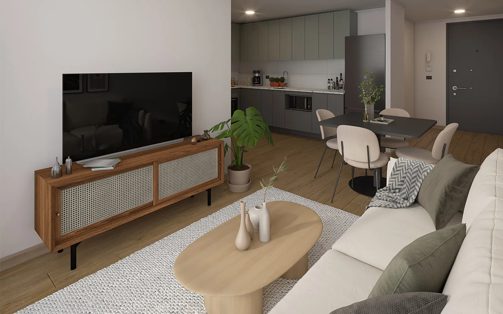 Piso vinílico SPC en áreas principales y cerámica en baños y terrazas, asegurando fácil mantención y mayor durabilidad.