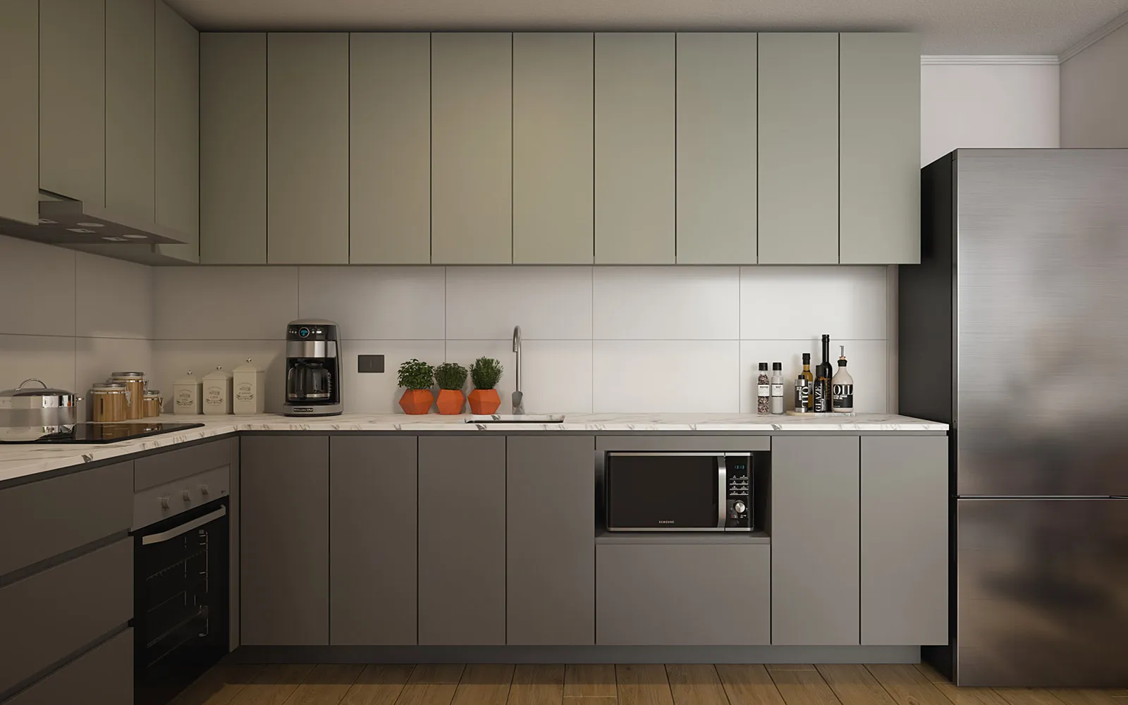 Muebles de cocina con cubierta de porcelanato, combinando estética y funcionalidad.