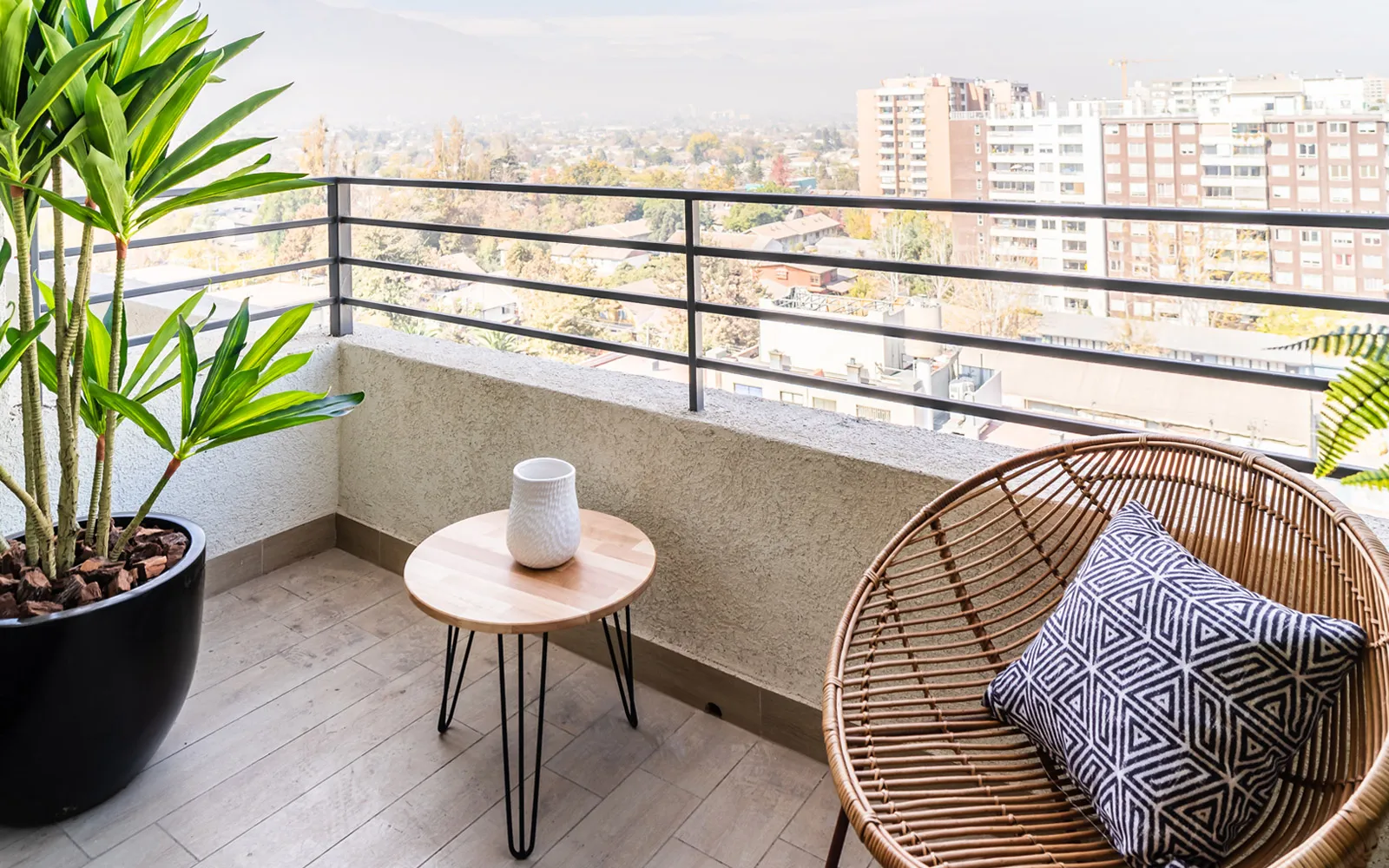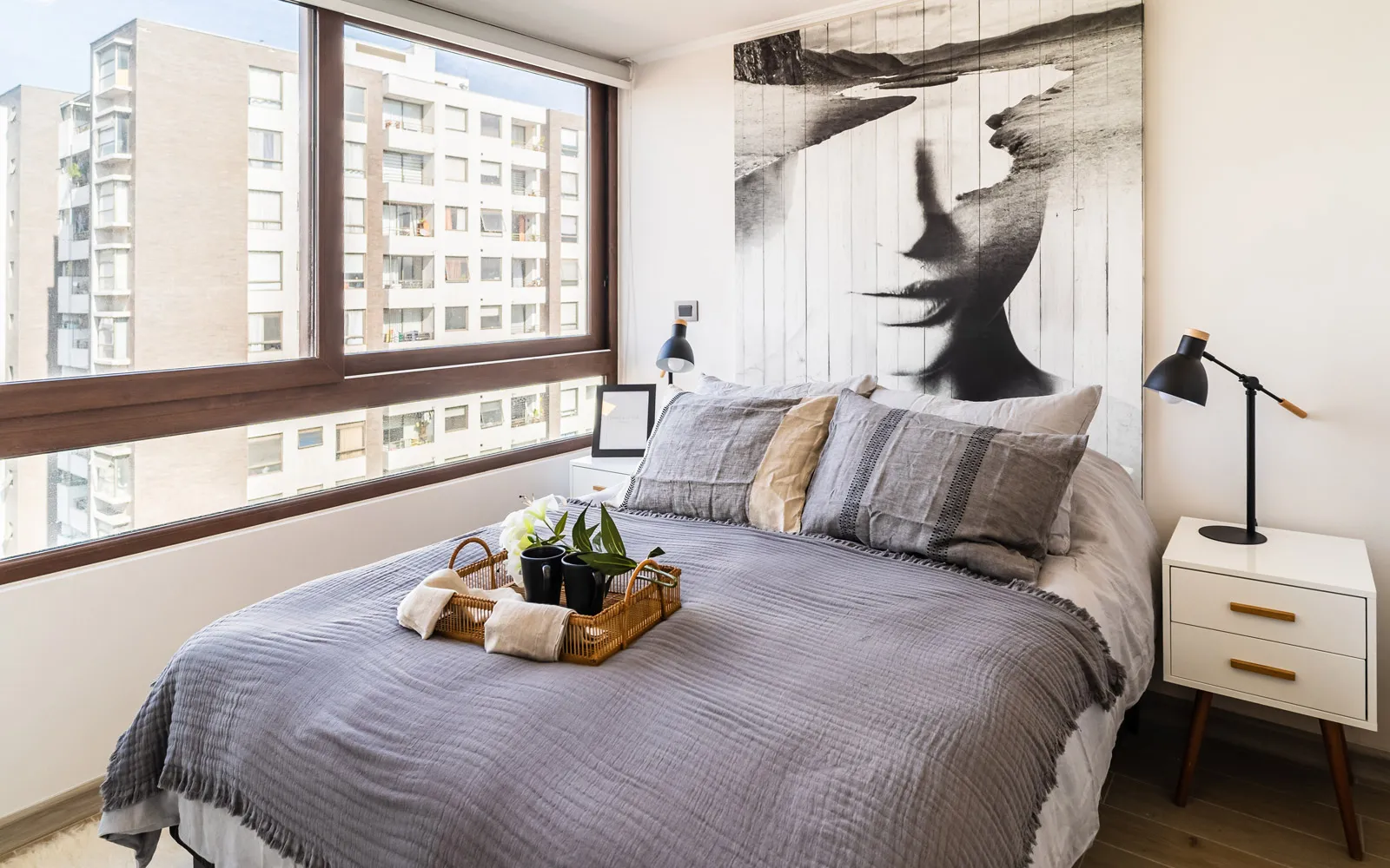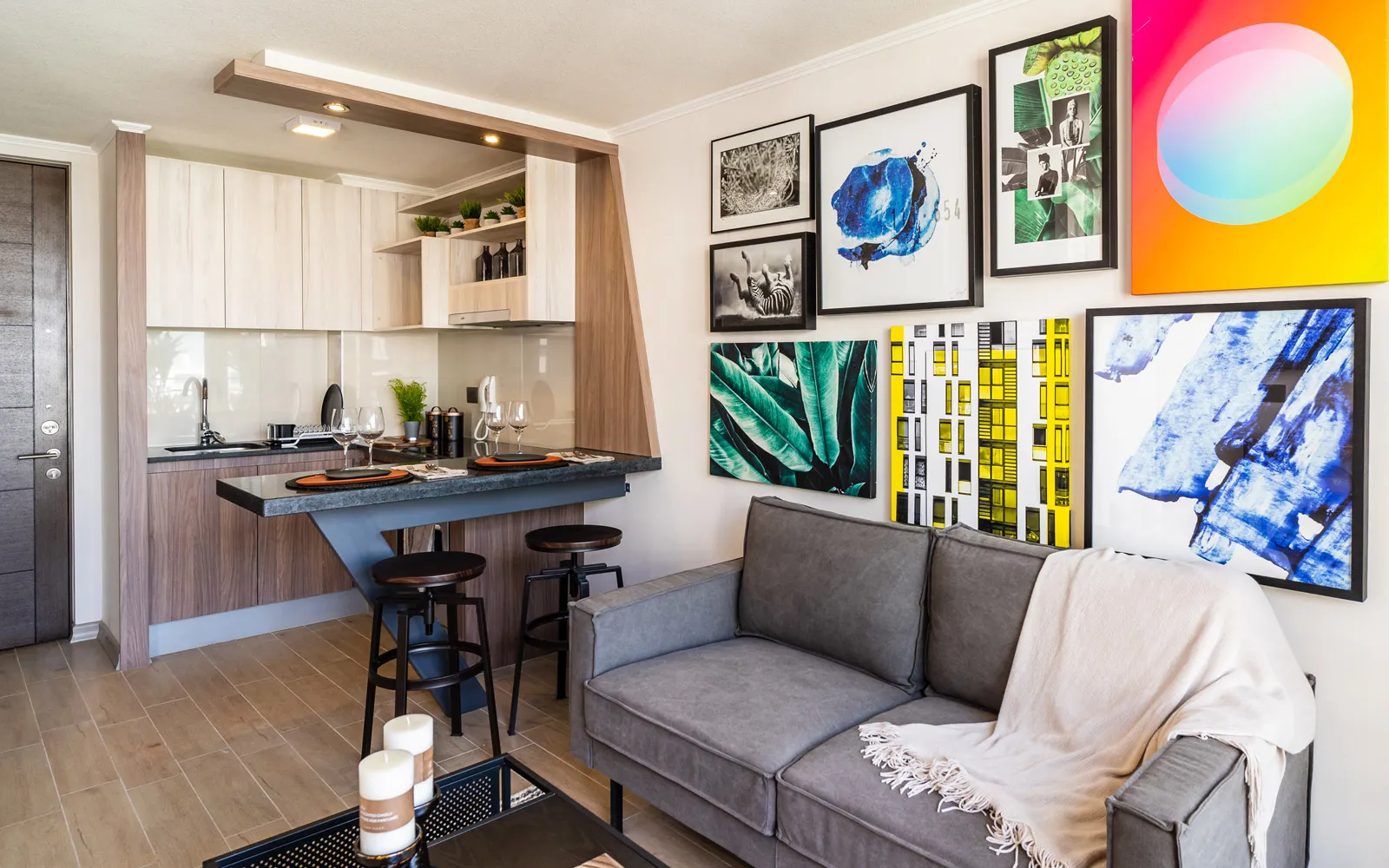 Piso porcelanato parket color roble en todo el departamento.
